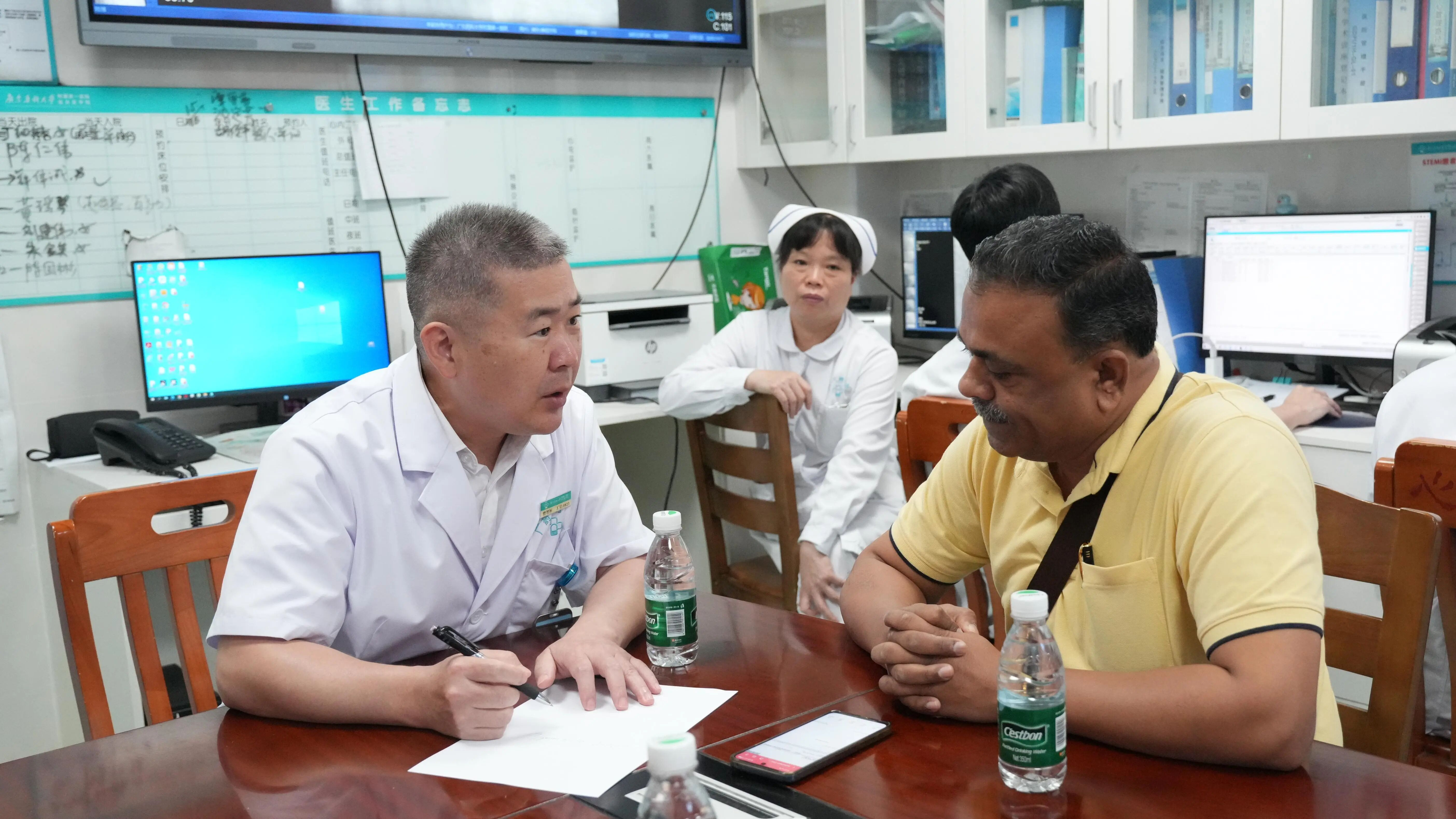 曾智桓教授向他介绍了一年前的抢救经过,并详细了解了他现在的用药清单。因他有心梗及糖尿病病史,尽管没有任何不舒服,曾智桓教授还是根据他的病情,全面地给出了合理的用药建议、日常生活注意事项及日后医院随诊检查项目等。PRASHANT先生还专门购买了中国生产的达格列净二甲双胍片,大赞中国便宜的药价。